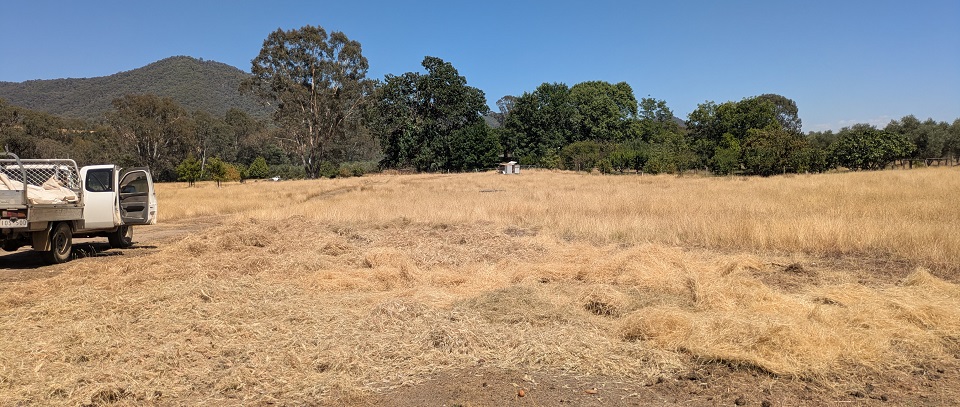 In December we had some earthworks done and finished up with a few cubic metres of soil, and then a neighbour gave away about 5 cubic metres of soil. All of that was added to this area, tipped out and raked into a crust to cover the grass clippings.