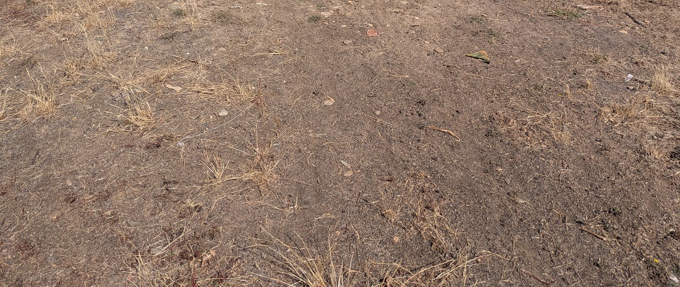 Unimproved mining spoil, Feb 2026, summer-baked bare earth