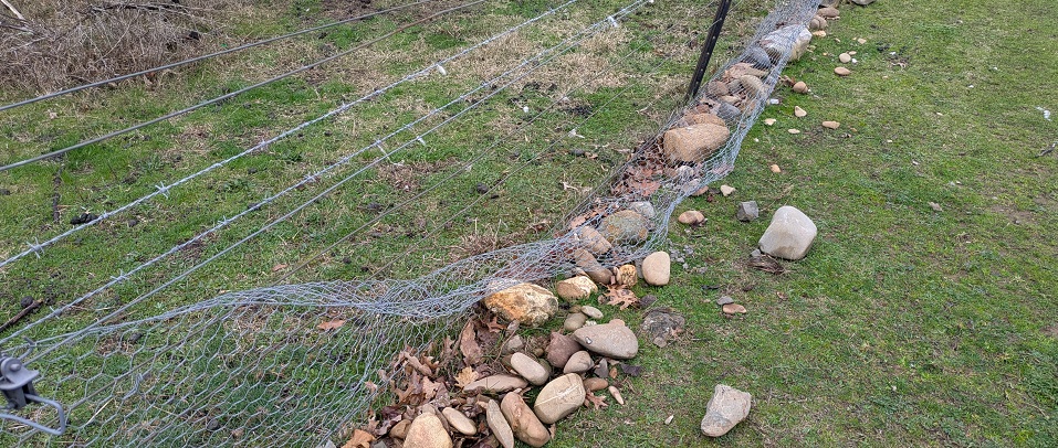 I then tried cutting small pieces of similar gauged wire, and then first with rocks tried plugging the holes again. I have now reached the stage of lacing new pieces of mesh to the fence and filling the hole with quick setting concrete.
