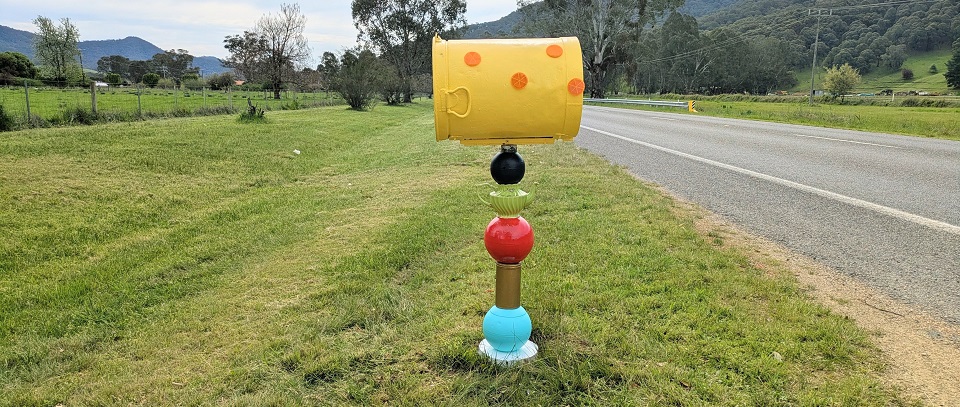 The letterbox was, I think, an old rubbish bin, metal, weighed a lot! It was welded onto a metal post, very rusted and the old Registered Mail Box (RMB) number painted on the side facing the road. RMB numbers aren't used any more along our strip of the Great Alpine Road, the postal service and deliveries use the street number.