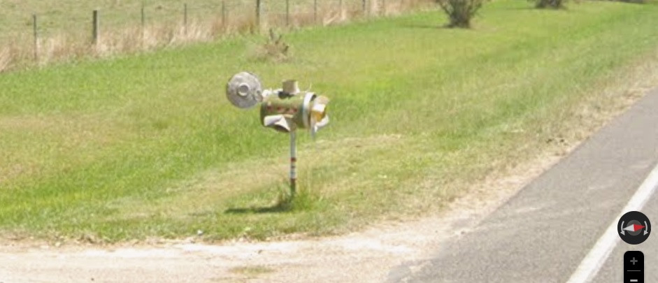 I never thought to take any photos of it at the time, when it was fresh. But it didn't last long. By the time the next Streetview image was taken, it was starting to look a bit bashed up. The plastic degraded in sunlight and became brittle, then bit by bit the petals fragmented off. It got hit by the lawnmower which distorted the metal flowers and smashed off the plastic petals much faster than just solar degrading.. The bin lid, which had previously been welded on to be a sort-of verandah, got knocked sideways. In the end it looked like: