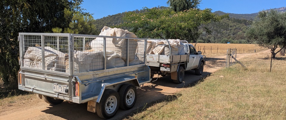 Then also today I collected native grass seed chaff from the nearby grass seed farm. Notionally its just straw, but there is a small percentage of remnant viable seed in it. They have just finished harvesting and processing the seed, so there was a LOT of chaff to take away.